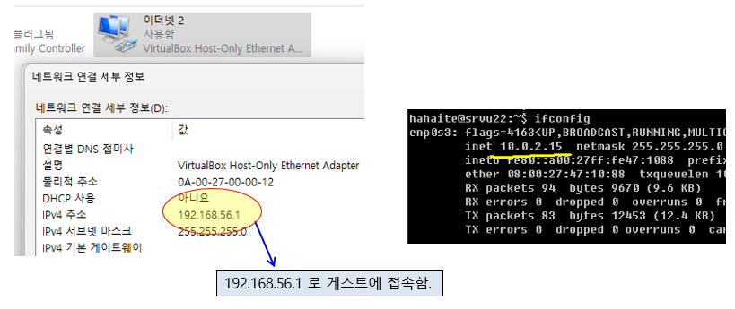 이 후, 게스트 접속은 호스트 전용 어댑터 IP 로 (192.168.56.xxx ) 접속할 수 있으며