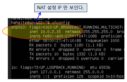 여기까지 하고 ifconfig 해보면 NAT 설정 IP (10.0.2.15) 만 나타나고