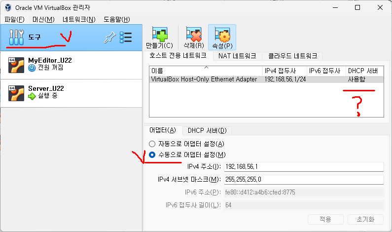 호스트 전용 어댑터 (192.168.56.xxx ) 는 안보인다.