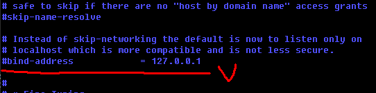 위 파일을 열어서 bind-address 가 127.0.0.1 인지 확인한다.