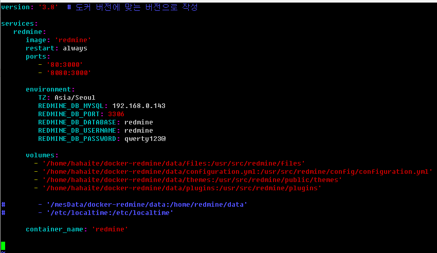 REDMINE_DB_MYSQL : DB 가 설치된 서버의 IP 나 hostname 을 적어준다.
